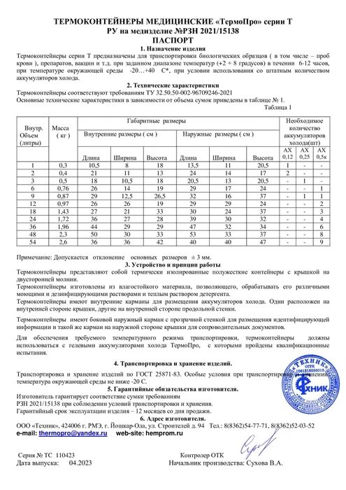 Термоконтейнер рекомендуется использовать с аккумуляторами холода ТермоПро. Количество аккумуляторов холода рассчитывается из соотношения 500 г веса аккумулятора на 6 литров внутреннего объема термоконтейнера.