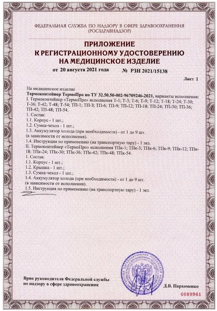 Сумка-чехол сшита из водоотталкивающей ткани Оксфорд 420, имеет мягкую крышку, термоизолированную вспененным полиэтиленом. Конструкция термоконтейнера предусматривает максимальное перекрытие швов и стыков для эффективного снижения теплопотерь. На крышке имеется карман на молнии из прозрачного ПВХ для сопроводительных документов. На боковой стенке расположен карман из прозрачного ПВХ для идентифицирующей информации. Внутри термоконтейнера имеются карманы для аккумуляторов холода.